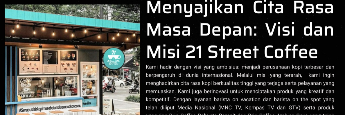 Misi 21 Street Coffee Kami hadir dengan visi yang ambisius: menjadi perusahaan kopi terbesar dan berpengaruh di dunia internasional. Melalui misi yang terarah, kami ingin menghadirkan cita rasa kopi berkualitas tinggi yang terjaga serta pelayanan yang memuaskan. Kami juga berinovasi untuk menciptakan produk yang kreatif dan kompetitif. Dengan layanan barista on vacation dan barista on the spot yang telah diliput Media Nasional (MNC TV, Kompas TV dan GTV) serta produk unggulan Drip Coffee Robusta Dampit dan Drip Coffee Arabica Gayo yang telah mengikuti kurasi-kurasi produk untuk ekspor, kami menyediakan pengalaman unik di setiap kesempatan. Kami telah mendapatkan berbagai sertifikat dan izin penting serta aktif dalam pameran dagang baik lokal maupun internasional.