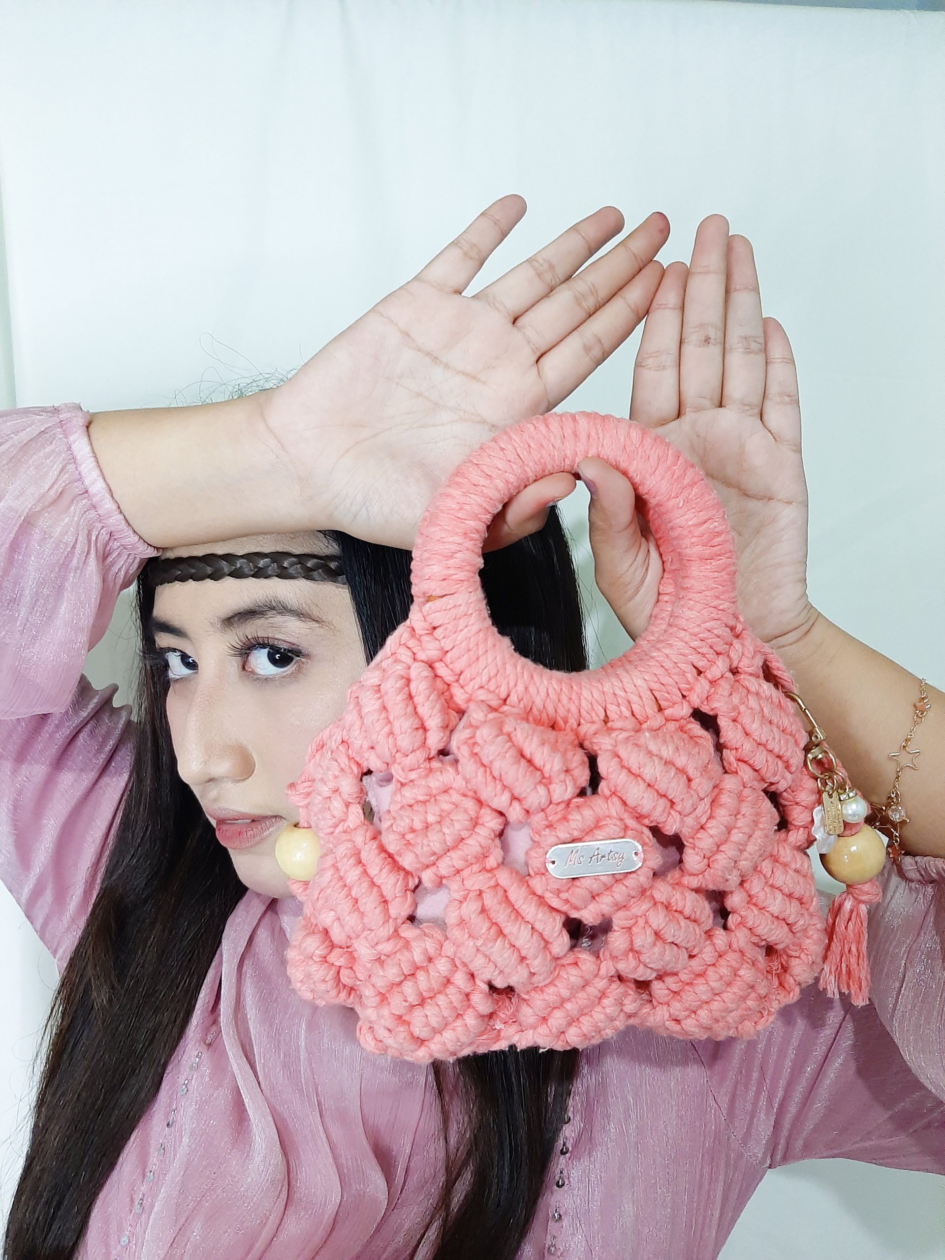 Say hi to our new product! Cherry Blossom - a classy mini bag made from: ✓a peach macrame rope ✓ puring (satin) ✓ size (p) 19cm x (l) 6cm x (t)12cm ✓ a gold sling bag ✓ a luxurious pearl key chain