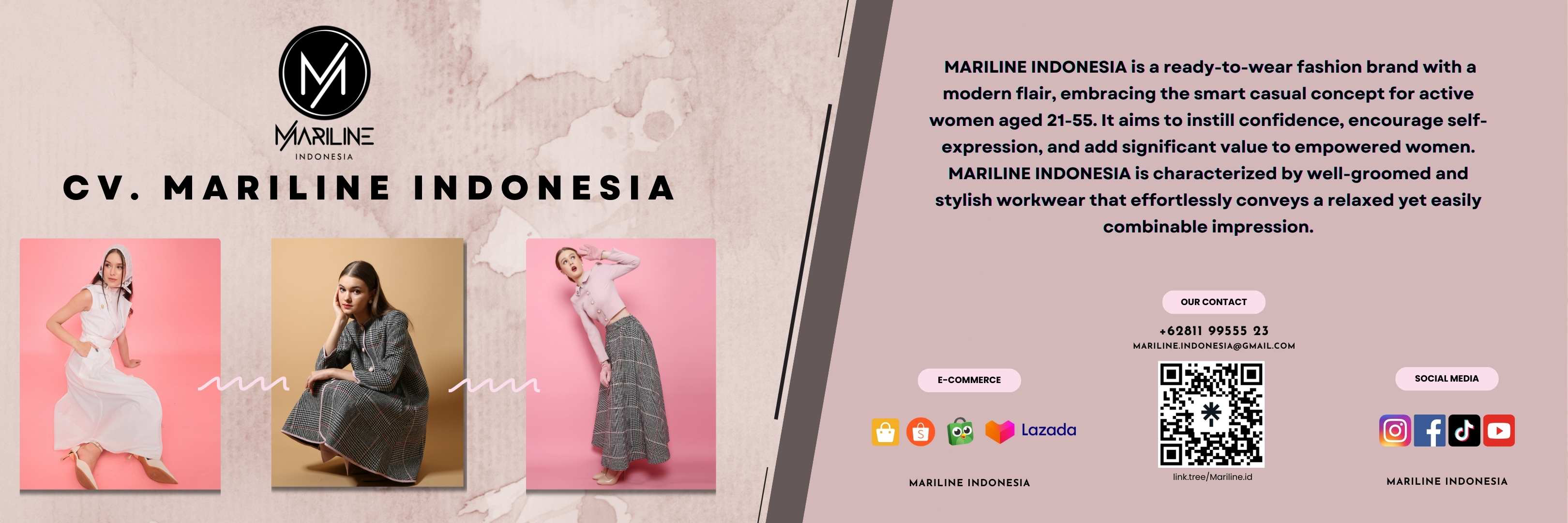 Didirikan pada Desember 2020 oleh Rosita Maryana, seorang fashion desainer lulusan LaSalle College International Jakarta, kemudian terdaftar dengan badan usaha CV. Mariline Indonesia. Target market Mariline Indonesia adalah wanita aktif berusia 21-55 tahun. Keunggulan produk kami adalah busana “tailored pieces” yang dikerjakan menggunakan teknik khusus “tailoring” dalam proses pola, pressing, dan jahitan. Teknik ini dikerjakan oleh pengrajin khusus di lingkungan Jawa Barat. Ciri khas dari Mariline Indonesia adalah gaya busana kerja yang rapi namun tetap memberikan kesan yang santai, stylish, dan mudah dipadupadankan.