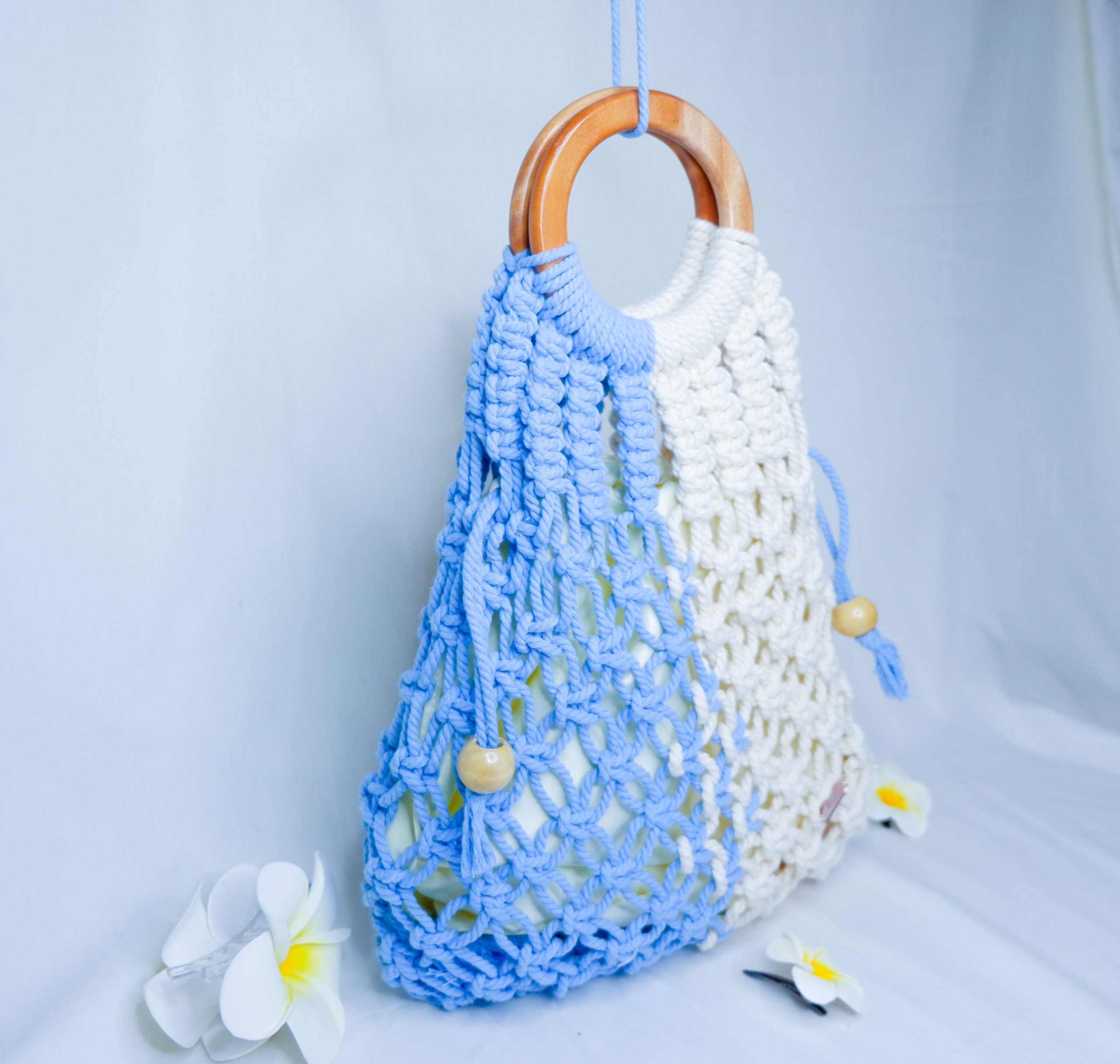 Lily of the Nile- a fresh totebag made from: ✓ sky blue x broken white macrame rope ✓ puring(satin) ✓ Size: 29cm (p) x 6cm (l) x 29 (t) ✓ unique wooden ring You can get this exclusive bag for only 247k! Grab it fas!!