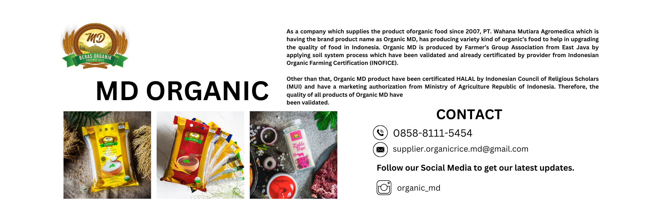 Sebagai Perusahaan Supplier Produk Pangan Organik sejak tahun 2007, PT. Wahana Mutiara Agromedica yang dikenal dengan nama merek produk Organic MD, telah menghasilkan berbagai produk pangan organik guna membantu dalam meningkatkan kualitas pangan di Indonesia. Organic MD diproduksi oleh Gabungan Kelompok Tani dari Jawa Tengah dengan menerapkan proses sistem tanam yang telah teruji dan telah tersertifikasi provider dari Lembaga Sertifikasi Pangan Organik (INOFICE). Selain itu, seluruh produk Organic MD telah tersertifikasi HALAL oleh Majelis Ulama Indonesia (MUI) dan memiliki izin edar dari Kementrian Pertanian Republik Indonesia. Dengan demikian, seluruh produk Organic MD telah teruji kualitasnya.