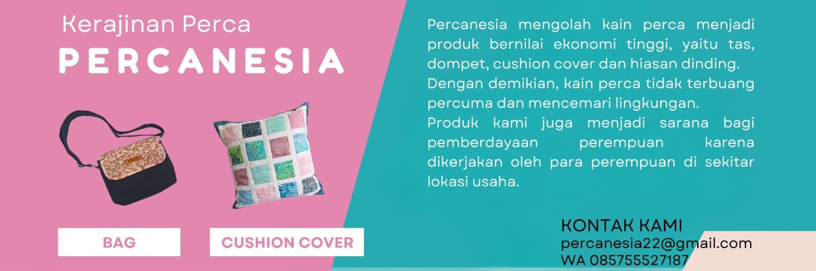 Kerajinan kain perca (patchwork n quilting), berupa tas, dompet dan homedecor (cushion cover, wall hanging). Mengolah kain perca wastra nusantara (seperti batik dan tenun, dikombinasi dengan kain katun produk lokal dan kain perca denim), menjadi produk bernilai ekonomi sehingga tidak terbuang dan mencemari lingkungan. Produk kami dikerjakan oleh perempuan sekitar yang merupakan ibu rumah tangga dengan latar belakang pendidikan SD-SMA.