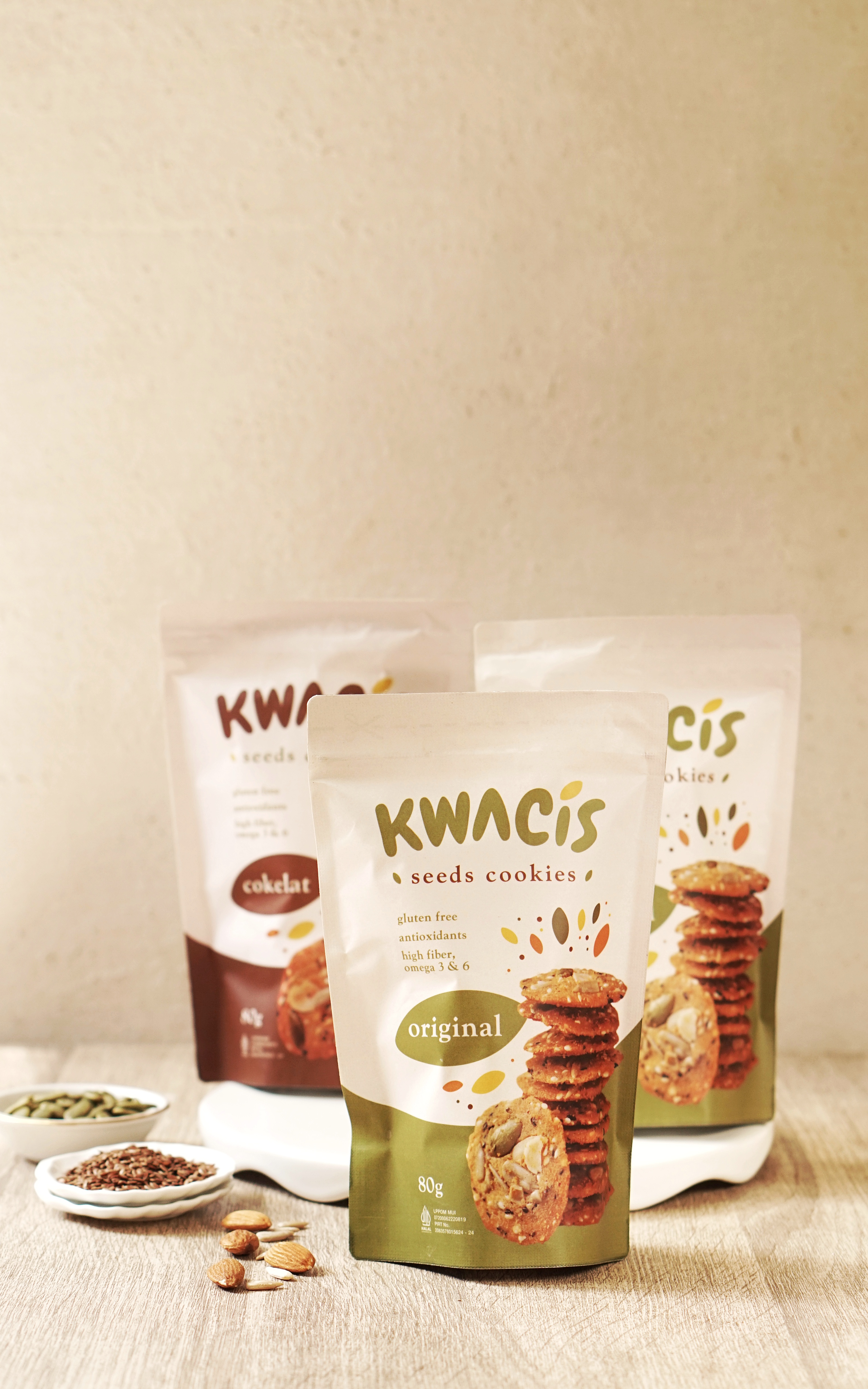 Cookies glutenfree bertekstur crispy dengan bahan lokal berupa tepung mocaf dari singkong dikobinasikan dengan kebaikan biji-bijian yaitu wijen, wijen hitam, biji labu, biji bunga matahari, chiaseeds, flaxseed, almond.