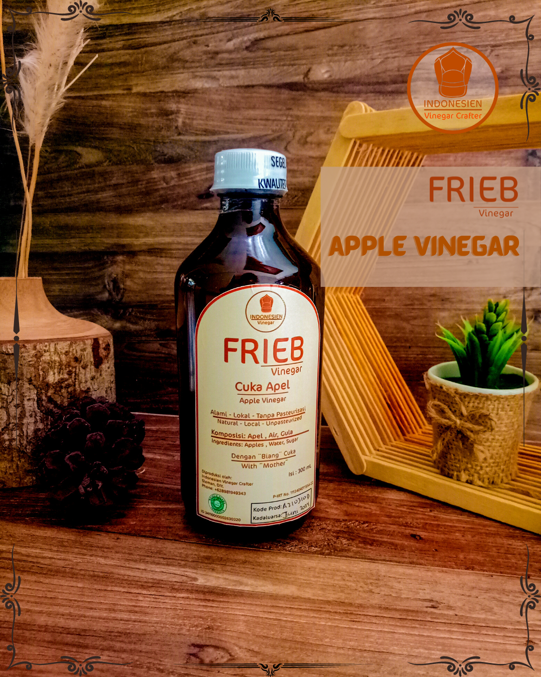 PT. Indonesien Vinegar Crafter merupakan usaha rumahan yang bergerak di bidang produk fermentasi halal terutama cuka halal hasil fermentasi buah. Saat ini produk utama kami berupa Cuka Apel dan Cuka Kurma dengan merek FRIEB Vinegar, sudah ber-PIRT, tersertifikasi halal oleh MUI dan BPJPH dan telah tersebar di beberapa kota di Pulau Jawa.