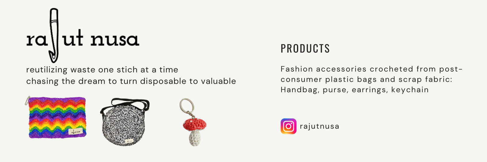 Rajut Nusa mendaur naik (upcycle) bahan-bahan bernilai rendah menjadi produk bernilai tinggi. Kami menggunakan teknik klasik rajut untuk mengolah plastik bekas menjadi dompet, tas, dan aksesoris lainnya. Selain ekologis, kami mempekerjakan kelompok wanita yang membutuhkan.